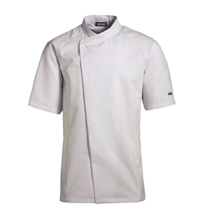 Kortärmad köksjacka med dolda tryckknappar, kinakrage samt hank i nacken för bröstförkläde. Diagonal trådriktning under arm, som ger stretcheffekt. Tvådelad pennficka på vänster ärm