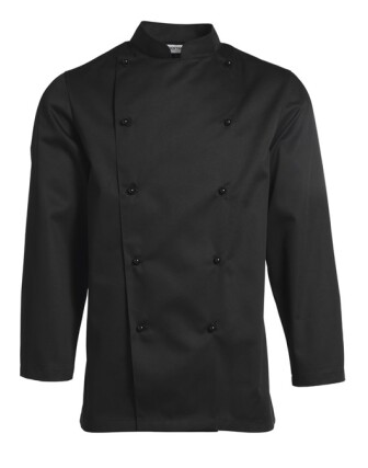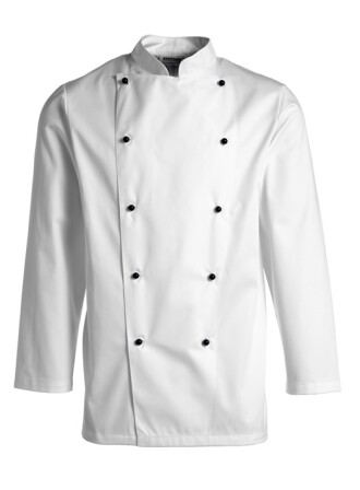 Med kinakrage och bröstficka samt dold tryckknappstängning och hank för förkläde.