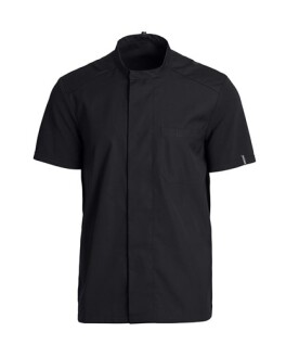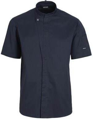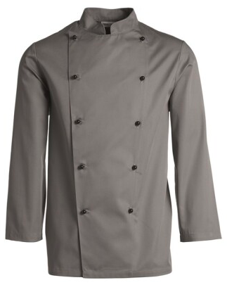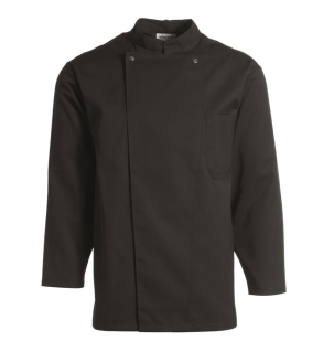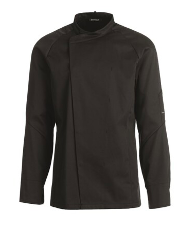 Långärmad köksjacka med dolda tryckknappar, kinakrage samt hank i nacken för bröstförkläde. Diagonal trådriktning under arm, som ger stretcheffekt. Tvådelad pennficka på vänster ärm
