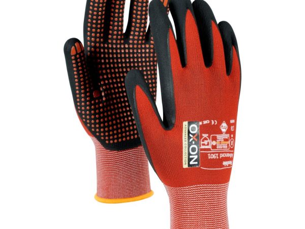 Sömlös stickad montagehandske i nylon/lycra som är doppad i microfoamad nitril i innerhanden och över fingertopparna. Försedd med orange nitrildots i innerhanden för slitstyrka och dämpning.