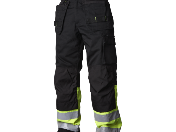 Smidiga hantverkarbyxor av slitstark bomull med rymliga hölsterfickor med extrafack och förstärkt insida. Påsydda förstärkta framfickor,. Hammarhank,, benficka med telefonfack och ID-kortsfack. Förböjda knän för optimal passform. Knäskyddsfickor i slitstark polyamid och Fluorescerande tyg och reflexer på benen. Stl: C44 – C62, D88 – D124.